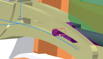 - No painel Junta, clique em Inserir junta. Na lista desdobrável, selecione Deslizamento: Curva de cilindro. Para a entrada 1, selecione o perfil da ranhura da abraçadeira da lâmina o seguidor percorre.
