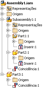 Montagens são compostas por peças combinadas nas submontagens físicas. No decorrer do projeto, é possível frequentemente quando uma peça é necessária, mas ainda não ter decidido como agrupar as submontagens. Usando o Autodesk Inventor, é possível inserir ou criar um componente em uma montagem sem a preocupação de onde ele estará situado na estrutura da montagem final.