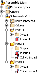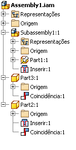 Você pode reestruturar uma montagem deslocando as peças, grupos de peças, padrões de componente ou submontagens completas dentro da hierarquia do navegador sem alterar a posição física das peças previamente inseridas.