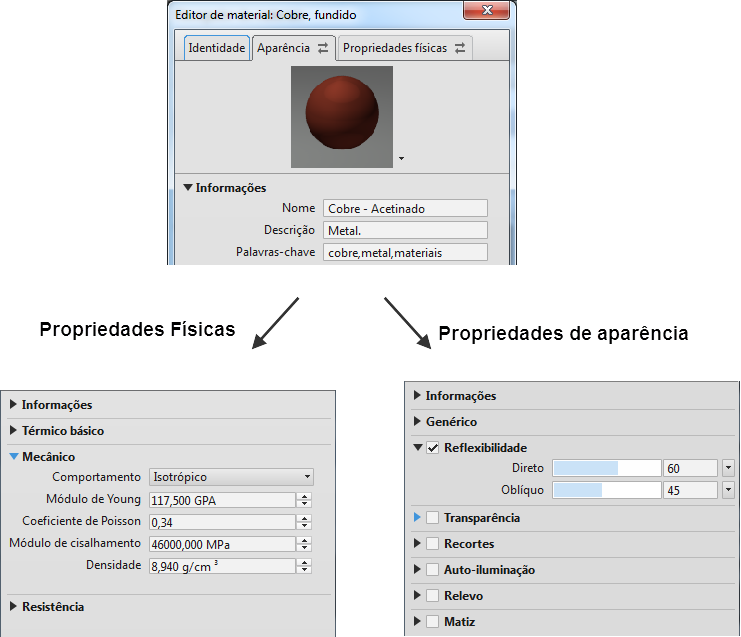 As definições de materiais possuem vários aspectos atribuídos a elas. O Inventor utiliza dois: Aparência e Propriedades físicas. Cada um possui propriedades específicas que contribuem para a definição do material.