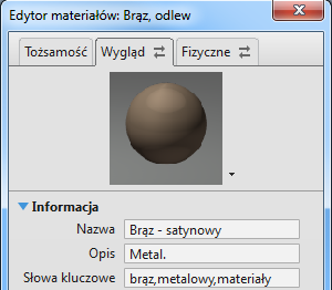 A figura mostra algumas das propriedades físicas e de aparência para um material de estanho maleável de cor bronze, como exibido no Editor de materiais. As propriedades físicas são agrupadas em um recurso do material e as propriedades de aparência, em outro. Ao editar um material, é possível alterar cada recurso de forma independente. Por exemplo, você pode alterar o material de cor bronze para que seja vermelho. Substitua o recurso de aparência pelo alumínio anodizado vermelho, um recurso com propriedades de aparência diferentes.