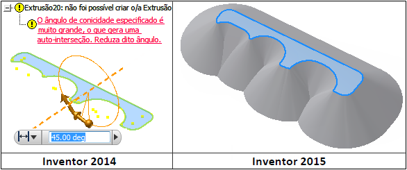 A solidez na criação de cascos e extrusões cônicas foi aprimorada. Agora é possível lidar com geometrias mais complexas. Por exemplo, no Inventor 2014, você pode fazer a extrusão do seguinte perfil com restrições de tangência apropriadas com um ângulo de conicidade até 27 graus apenas. No Inventor 2015, o ângulo de conicidade pode ter de 0 a 90 graus.