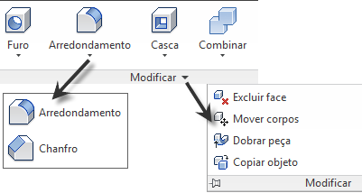 Diversos comandos foram movidos de um painel principal para o subpainel ou para uma lista suspensa no painel. Por exemplo, em um arquivo de peça (.ipt), o painel Modificar da guia Modelo 3D foi otimizado para exibir menos comandos por padrão. Os outros comandos Modificar foram movidos para um menu suspenso ou para o painel Modificar expandido: