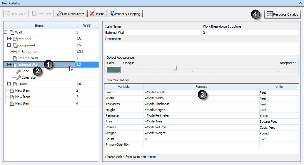 O Item Catalog é um banco de dados organizacional para o levantamento. O Item Catalog e o Resource Catalog compartilham a mesma estrutura, uma árvore de seleção, um painel de variáveis e informações gerais. Os itens no Item Catalog podem ser diretamente associados a um objeto de modelo, como uma parede ou uma janela. Os itens podem existir de forma independente ou podem conter recursos.