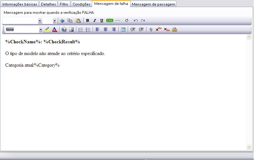 No topo há um editor de HTML WYSIWYG padrão. Na parte inferior do corpo, está localizada a área onde você deve inserir textos, imagens, hiperlinks, tabelas e detalhes para auxiliar os usuários a identificar por que a verificação em questão falhou. As áreas com o símbolo % são de "texto dinâmico". Quando usadas, elas serão substituídas pelos valores reais da verificação no Navegador de resultados. O texto dinâmico pode ser adicionado clicando com o botão direito do mouse no corpo e selecionando a partir do botão suspenso Inserir: