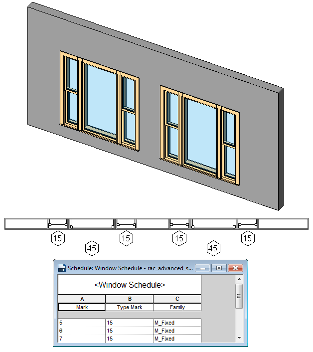 No exemplo mostrado abaixo, a mesma família de janela tripla foi criada, mas com uma nova família de janelas, usada como a família hospedeira, e as janelas fixas e as janelas suspensas duplas, carregadas como famílias compartilhadas. Observe a diferença na marcação e tabela.