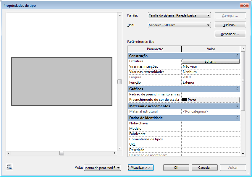 Segue um exemplo de uma caixa de diálogo Propriedades de tipo para um tipo de parede, com o painel Visualizar exibido.
