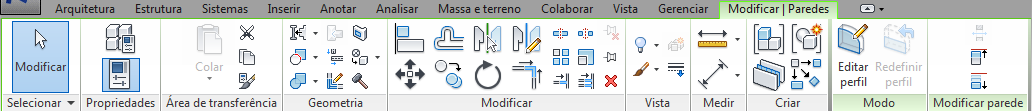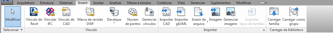 A faixa de opções é exibida quando um arquivo é criado ou aberto. Ela fornece todas as ferramentas necessárias para criar um projeto ou família.