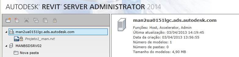 Utilize o Administrador do Revit Server para gerenciar as pastas e modelos centrais no Host do Revit Server e para bloquear modelos para as atividades administrativas.