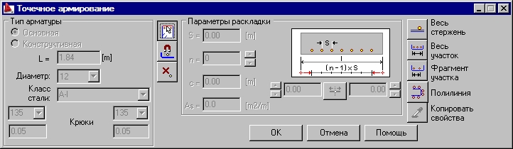 Оно может быть также открыто автоматически при раскладке арматуры. В этом случае диалоговое окно открывается в режиме определения рабочей арматуры с соответствующим диаметром, номером позиции и длиной стержня (параметры недоступны).