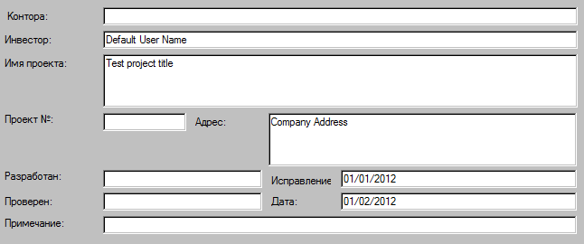 Данное диалоговое окно содержит несколько полей редактирования, позволяющих ввести общую информацию о проекте. Эти тексты соответствуют переменным, использованным в ячейках таблиц, предусмотренных на чертежах, а также в заголовках распечаток: