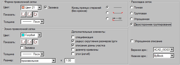 Опции в поле Раскладка сеток используют, чтобы указать стиль линий, которые используются для черчения верхней и нижней арматуры.