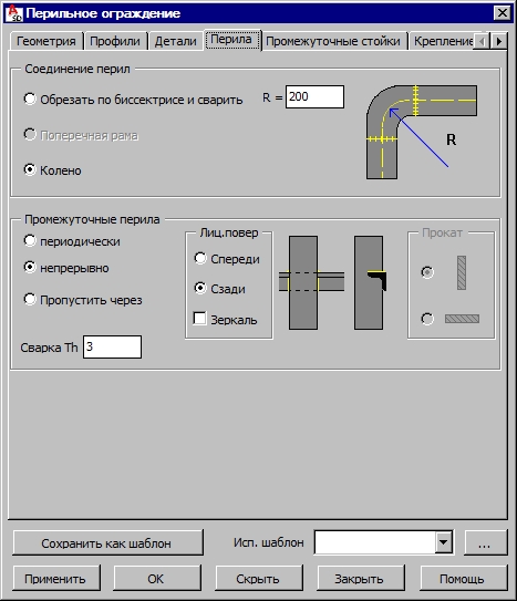 - доступно только для прямых и вертикальных типов поручней. Перекладины сплошные по всей длине полилинии; в точках стыков перекладин изгибаются сегменты. Для этого типа соединения определяется радиус изгиба R;
