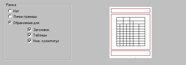 - Обрамление для - заголовки и нижние колонтитулы обрамлены (пользователь может выбрать рамку только для нижнего колонтитула, только для заголовка, только для таблицы или комбинацию рамок для перечисленных элементов).