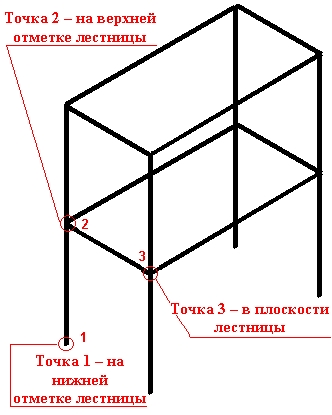 - Указывают три точки, определяющие расположение лестницы: P1, P2 и P3 как показано на рисунке.