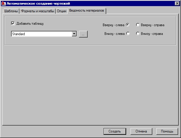На закладке Ведомость материалов в диалоговом окне Автоматическое создание чертежей указывают параметры таблицы-ведомости.