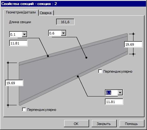 На закладке Геометрия/детали в диалоговом окне Свойства секций определяют геометрические характеристики выбранной секции многосекционной балки.