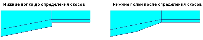 После включения опции Создать скосы доступны поля редактирования (отдельно для верхней и нижней полки), где скос пластины может быть создан с помощью указания величины уклона линии скоса (например, 1:4). Длина скоса секции рассчитывается по той же формуле, что дана для скосов, учитывающих ширину полок. Пример скоса для соединения нижних полок (включая одну наклонную) показан на рисунке ниже.