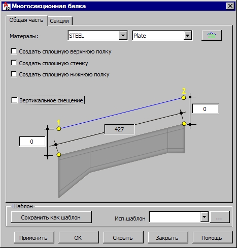 Внизу диалогового окна находится поле подбора Исп. шаблон, которое содержит созданные пользователем шаблоны (эскизы) многосекционных балок. После создания геометрии составной колонны можно её сохранить, напечатав имя в поле Шаблон и нажав на кнопку Сохранить как шаблон. В дальнейшем после начала создания многосекционной балки и выбора имени сохраненного шаблона, все параметры в диалоговом окне будут настроены такими же, каками они были сохранены в шаблоне.