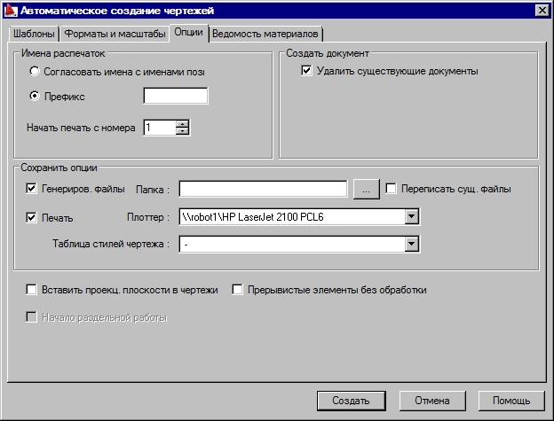 Диалоговое окно Автоматическое создание чертежей принимает вид, показанный на рисунке ниже, после того, как выбрана закладка Опции.