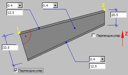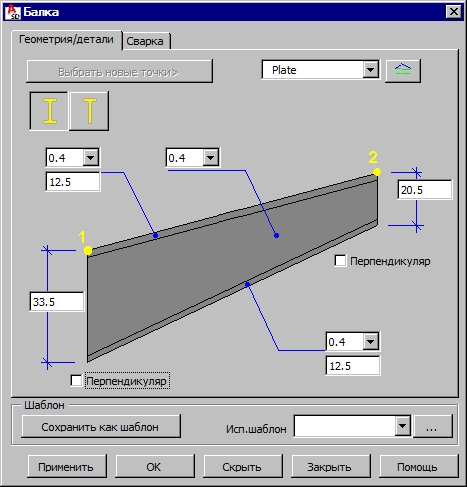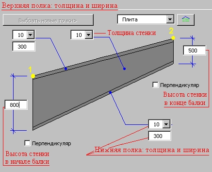 - высота стенки в начале и в конце составной балки (способ создания зависит от опции Перпендикуляр).