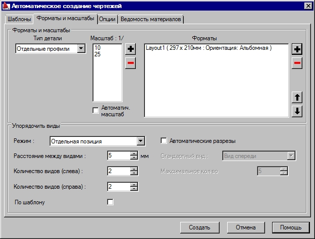 При переходе на закладку Форматы и масштабы диалоговое окно Автоматическое создание чертежей принимает следующий вид.