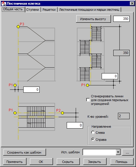 После задания характерных точек лестницы (создание точек P1, P2 и P3 показано на рисунке ниже) на экране появляется диалоговое окно Лестничная клетка.