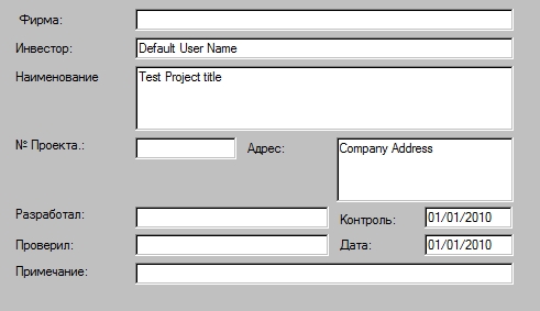 Данное диалоговое окно содержит несколько полей редактирования, позволяющих ввести общую информацию о проекте. Эти тексты соответствуют переменным, использованным в ячейках таблиц, предусмотренных на чертежах, а также в заголовках распечаток: