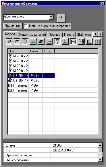 Здесь можно увидеть текущий список объектов, созданных в проекте Autodesk AutoCAD Structural Detailing - Steel Каждая закладка предназначена для представления элементов на различных стадиях процесса проектирования, поэтому каждая из них содержит разные типы объектов, организованных различным способом.