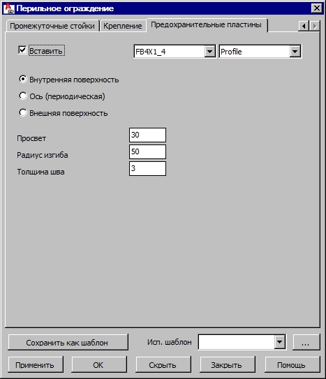 Предохранительная пластина располагается вертикально, она является нижним ограничением и приваривается к стойкам поручней. Если опция Вставить выключена, то пластина не создаётся (опции на этой закладке недоступны). Если для перил необходимо создать предохранительную пластину, активируют опцию Вставить, расположенную вверху диалогового окна.
