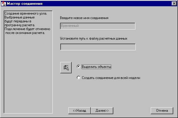 - Если выбрана опция Выделить объекты, становится доступной кнопка, дающая возможность графического выбора на экране объектов, которые должны быть включены в связь.