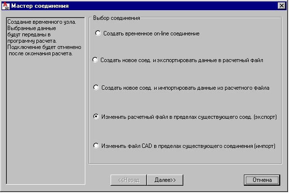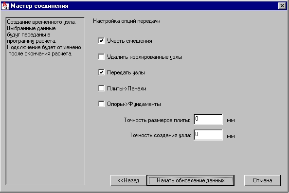 Операция обновления данных файла CAD и файла, содержащего расчётную схему конструкции, выполняется в диалоговом окне Мастер соединения, показанном на рисунке ниже. Опция доступна: