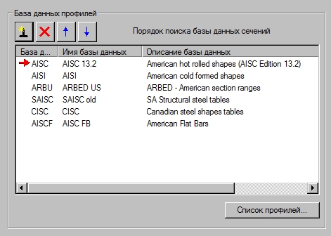 В этом диалоговом окне поле База данных профилей содержит список папок профилей (баз данных), доступных в данном проекте. При нажатии на кнопку Список профилей открывается диалоговое окно, в котором отображаются профили, применяемые в данном проекте.