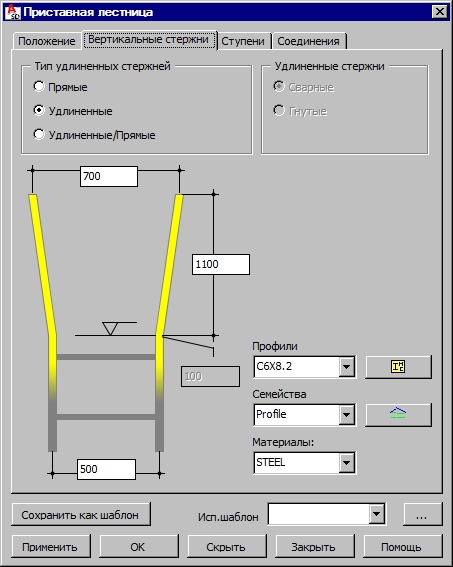 После определения всех параметров вертикальных стержней переходят на закладку Ступени.