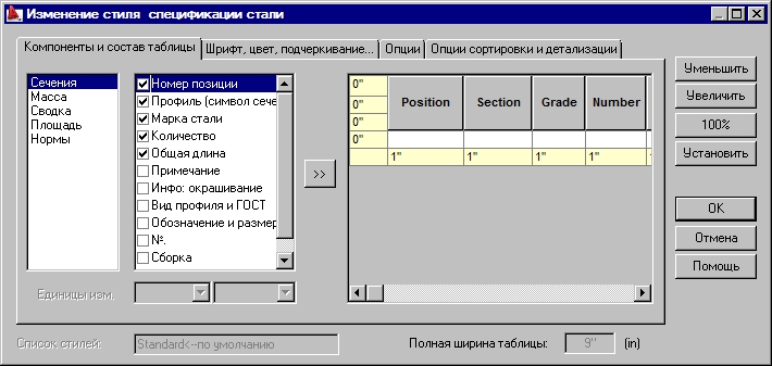 На рисунке ниже показано диалоговое окно Определение нового стиля спецификации стали на закладке Компоненты и состав таблицы.
