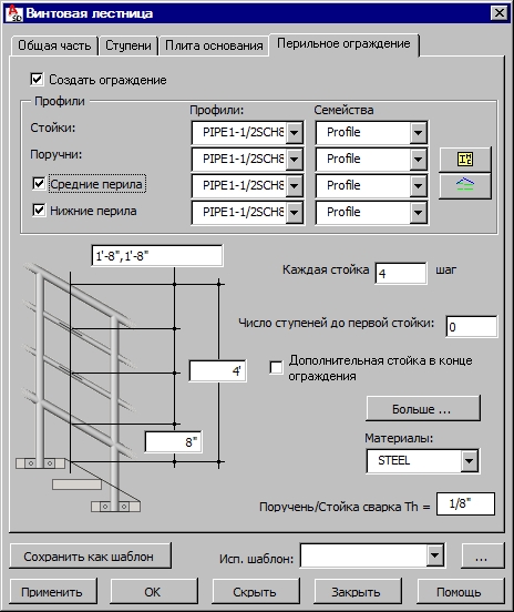 На этой закладке определяют параметры перильного ограждения винтовой лестницы.