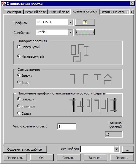 После определения геометрических характеристик стропильной фермы переходят на закладку Крайние стойки и Остальные стойки. Опции этого диалогового окна позволяют создавать следующие атрибуты для стоек: профили стержней и типы семейств стержней.