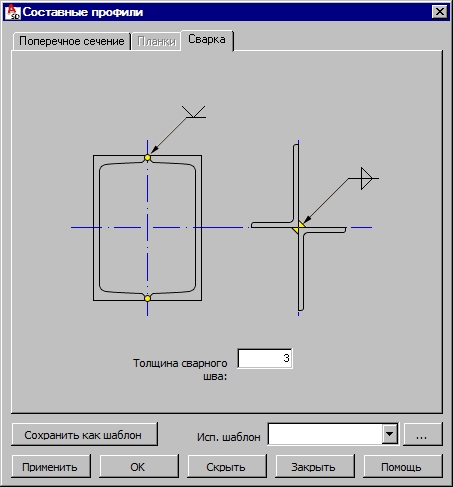 После определения геометрических характеристик составного профиля переходят на закладку Сварка для определения параметров сварных швов вдоль всей длины профиля (углового или стыкового шва в зависимости от типа входящих в составной профиль сечений).