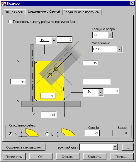 После определения геометрических характеристик подкоса можно переходить на закладку Соединение с балкой.