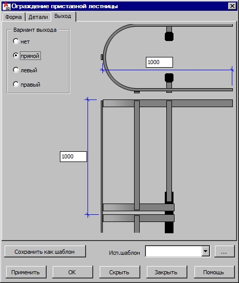 - Размеры выхода определяются в диалоговом окне, для чего вводят два параметра: высоту перил и длину поручня.