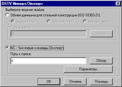- файлы, содержащие описания деталей стальной конструкции, которые должны применяться при использовании числовых команд (файлы могут быть только экспортированы); в поле Путь к файлу пользователь должен указать расположение папки, в которую будут записаны файлы с описанием деталей конструкции (расположение папки может быть также указано после нажатия кнопки Обзор); в этом режиме – для каждой детали стальной конструкции, которой назначена позиция – в указанной папке создаётся отдельный файл, содержащий описание деталей. При нажатии на кнопку Параметры открывается диалоговое окно Параметры DSTV NC.