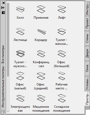 Пользовательские палитры, сформированные администратором САПР или другими пользователями, могут содержать инструменты пространств со стилями и свойствами пространств, адаптированными к конкретным проектам или офисным стандартам.