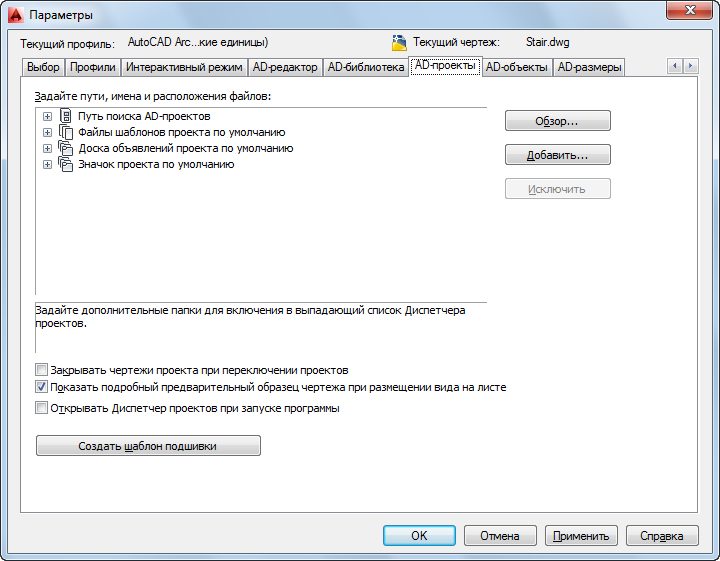Эти настройки применяются при создании новых проектов без использования шаблонов. Если новый проект создается на основе шаблонного проекта, то вместо рассматриваемых здесь настроек используются настройки шаблонного проекта.