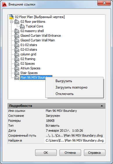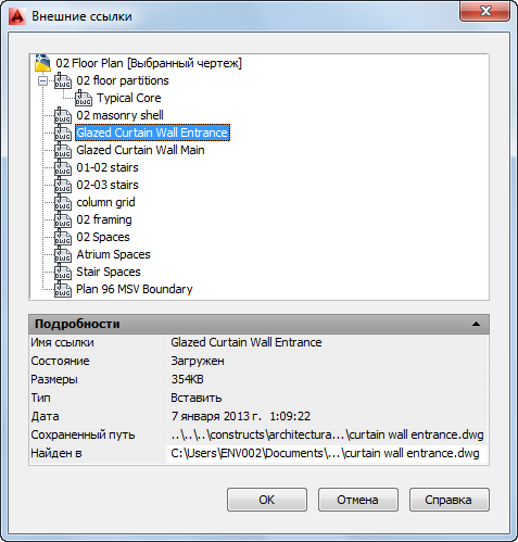 Прим.: Кроме того, можно вывести внешние ссылки на экран, открыв конструкцию в области чертежа AutoCAD Architecture и воспользовавшись Диспетчером ссылок AutoCAD.