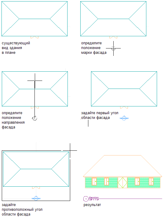 Первым шагом при создании фасадов является чертеж линии фасада, относящейся к используемой модели здания. Линия фасада определяет границы вертикальной проекции модели здания.