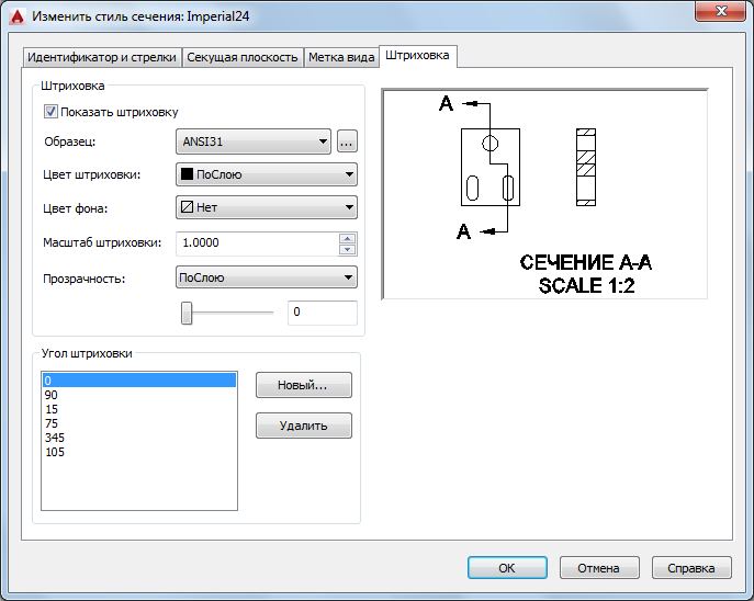 - Задает образец штриховки для всех штриховок в видах сечений.