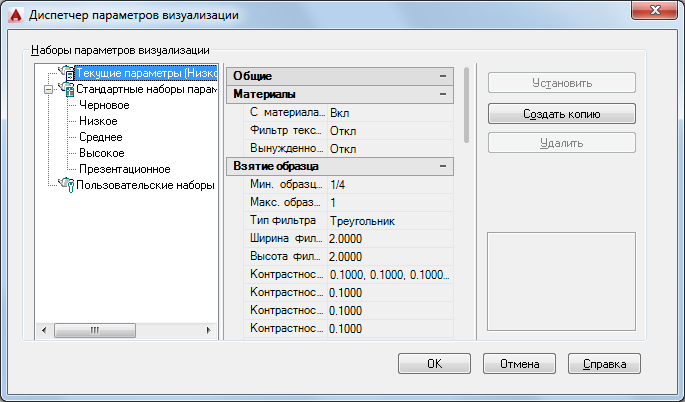 На панели дерева отображаются стандартные и пользовательские наборы параметров, сохраненные вместе с текущим чертежом. Новые наборы параметров всегда добавляются в раздел "Пользовательские наборы параметров визуализации". Кроме того, они отображаются в списках "Наборы параметров визуализации" на панели "Визуализация" ленты и на палитре "Дополнительные параметры визуализации". Порядок наборов можно изменить путем их перетаскивания в дереве. Предусмотрено удаление только пользовательских наборов параметров визуализации.