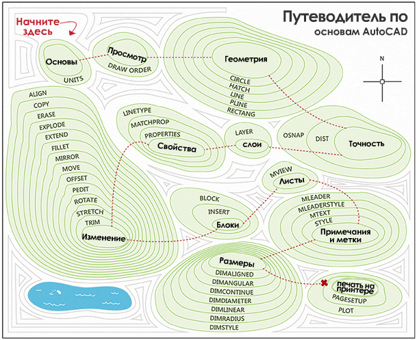 Добро пожаловать в руководство "Путеводитель по AutoCAD". Здесь описаны 42 основные команды, необходимые для создания 2D-чертежей с использованием AutoCAD или AutoCAD LT.