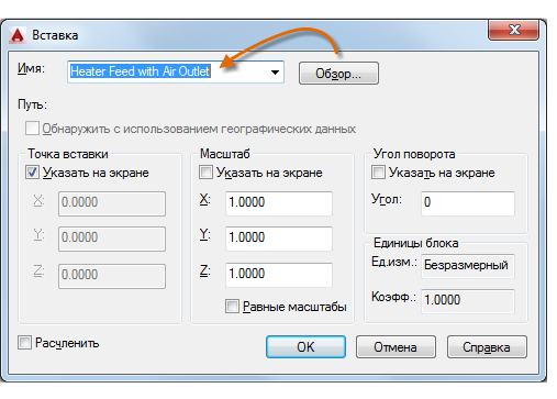 После вставки определение блока сохраняется в текущем чертеже. Теперь можно выбрать блоки непосредственно в раскрывающемся списке "Имя", не нажимая кнопку "Обзор".