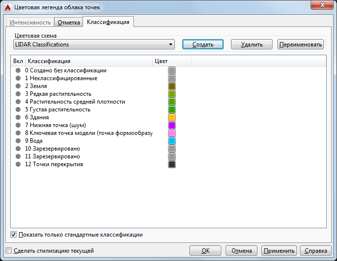 Редактирование параметров цветовой схемы для стилизации облака точек по классификации.